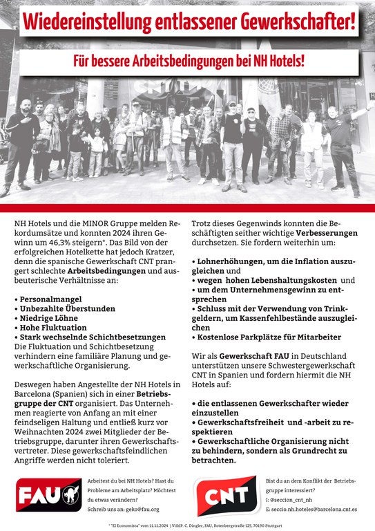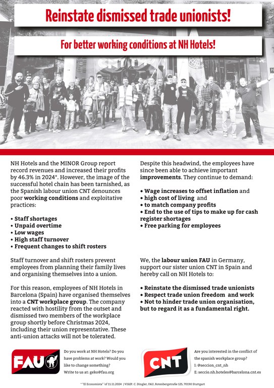 Mehr als ein Jahr nach der Entlassung zweier Mitglieder der Betriebsgruppe der CNT Spanien in NH Hotels Barcelona, darunter auch der Gewerkschaftsvertreter, bleibt die Betriebsgruppe im Unternehmen aktiv und hat Erfolge erzielt, wie die Installation einer Klimaanlage in der Küche eines Hotels oder auch dass mehrere befristete Arbeitsverträge in unbefristete umgewandelt wurden.