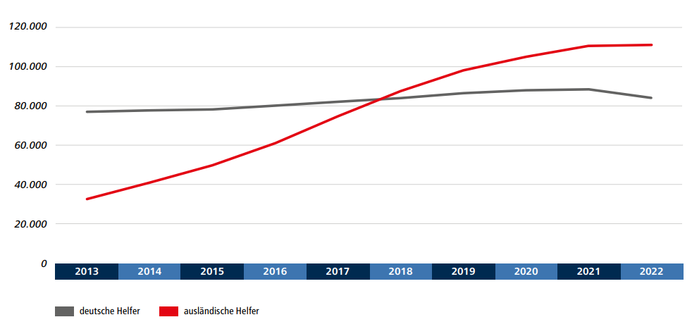 Unter deutschen Arbeitskräften liegt der Anteil an Helfer*innen bei etwa 30%. Unter Beschäftigten aus dem Westbalkan, Polen, Rumänien und Bulgarien liegt er jeweils deutlich über der Hälfte, bei jenen aus Rumänien und Bulgarien sogar über 70%.3