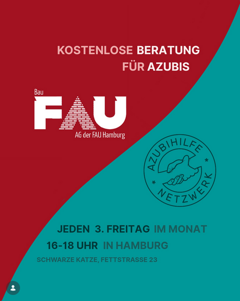 Anschließend an die Beratungsstunde startet wie gewohnt das offene Treffen „Bau-Freitag“, eine Möglichkeit für entspannten Austausch für alle Menschen, die im Baugewerbe arbeiten und solche, die sich solidarisch zu ihnen stellen. Wir reden über die drängenden Probleme der Arbeitenden in der Baubranche, aber vor allem über Möglichkeiten wie wir diese Probleme überwinden. Kommt gerne vobei!